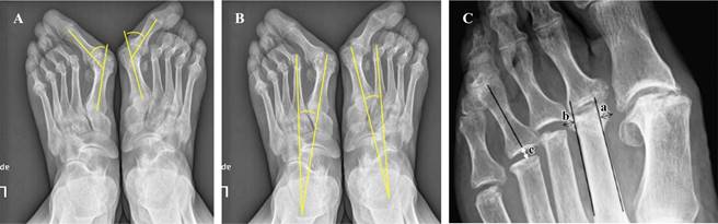 Figura 1: Ilustración de las medidas radiográficas. A) Ángulo de hallux valgus. B) Ángulo intermetatarsal. C) Espacio de artroplastía de resección ( c ) y formación de osteofitos por remodelación en el muñón metatarsal (a + b ).