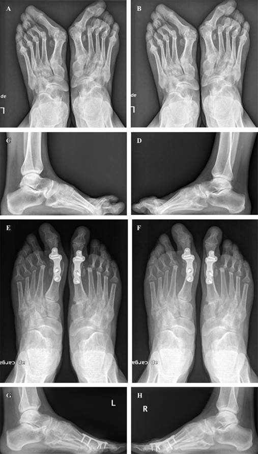 Figura 2: Radiografías anteroposteriores y laterales en bipedestación, pre y postoperatorias, en el seguimiento final de un paciente intervenido en ambos pies (A-H). Las radiografías preoperatorias muestran deformidad tipo hallux valgus grave y destrucción/luxación de todas las articulaciones metatarsofalángicas menores (A-D). Se realizó artrodesis de la primera articulación metatarsofalángica combinada con la artroplastía de resección de las articulaciones metatarsofalángicas menores (E-H).