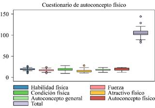 El cuestionario de autoconcepto físico (CAF) es una herramienta, que evalúa el autoconcepto físico, permitiendo distinguir las siguientes dimensiones: habilidad física, condición física, atractivo físico, fuerza.24