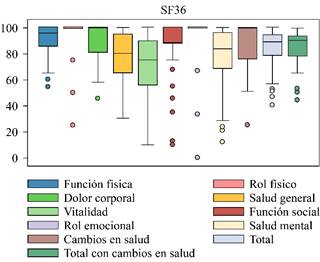 Otra forma de evaluación del paciente podría ser con el cuestionario de salud SF-36 fue diseñado por Ware y colaboradores.14 Consta de 36 preguntas que valoran la salud física y mental del paciente. El cuestionario cubre ocho valores: salud general, función física, rol físico, rol emocional, función social, dolor corporal, vitalidad y salud mental. Para la valoración de esta escala, se establece una puntuación de 0 a 100 en cada uno de los ocho valores.15,16,17,18