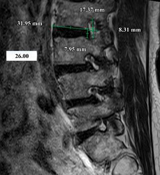 Figure 2: Lumbar plain magnetic resonance imaging in T2 sequence with sagittal view. Combined measurement of foraminal height and width, inferior endplate, index of foraminal width/inferior endplate with a result of 26%, and measurement of posterior disc height.