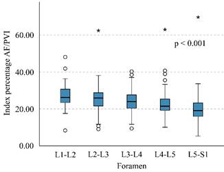 To ascertain heterogeneity among the foraminal width/lower endplate index in the five studied foramina, a Kruskal-Wallis test was performed, where a p-value < 0.05 was deemed statistically significant.