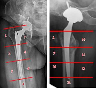 Radiológicos: hallazgo en radiografías simples de radiolucencias progresivas de más de 2 mm en dos radiografías espaciadas al menos un año (describiendo su localización según las zonas de Gruen) (Figura 2). También se tuvieron en cuenta otros hallazgos radiológicos como el stress shielding, el fenómeno del pedestal, el desgaste del polietileno o el hundimiento del vástago. Por último, también incluimos pacientes con hallazgos incongruentes en radiografías simples, pero que mostraron signos de aflojamiento en otras pruebas complementarias radiológicas (resonancia magnética, tomografía computarizada y gammagrafía).