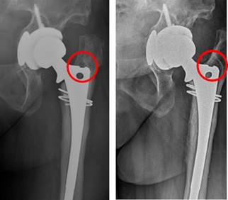 Figura 5: Hundimiento del vástago, medido empleando como referencia distancia entre el hombro de la prótesis y la punta del trocánter mayor.