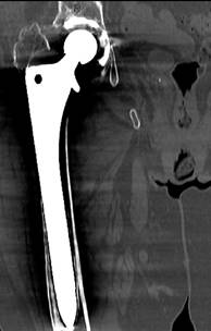 Con respecto al uso de otras pruebas empleadas en el diagnóstico por imagen del aflojamiento, cabe destacar la tomografía axial computarizada (TAC) (Figura 6) y la gammagrafía (Figura 7). Se efectuaron en 36.8% de los pacientes con aflojamiento sin fractura para confirmación diagnóstica de dicho aflojamiento, cuando éste era inconcluyente a través del estudio de radiografías simples (mostrando tendencia, pero no asociación estadísticamente significativa p = 0.062). Cabe reseñar también que no fueron empleadas para la ayuda al diagnóstico en ninguno de los pacientes del grupo de los casos.