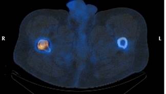 Figura 7: Diagnóstico de aflojamiento por medio de gammagrafía. Se aprecia hipercaptación en la punta del vástago.