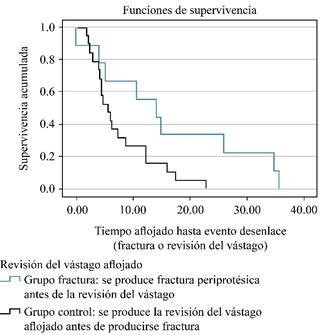 Figura 8: Curva Kaplan-Meier de supervivencia del implante desde que se evidencia el aflojamiento hasta que se produce el evento desenlace, ya sea fractura periprotésica o recambio del vástago. Nótese un mayor tiempo de supervivencia en los vástagos que terminaron en fractura.