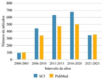 Figura 1: Artículos publicados sobre navegación y artroplastías totales de rodilla en PubMed y SCI.