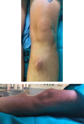 A 46-year-old man presented at the clinic with knee pain and a 4 × 3 cm soft tissue tumor on the right tibial. His medical history included sporadic tobacco and alcohol consumption and up to six pneumothorax episodes, needing surgery 13 years prior to consultation. He refers onset of tumoration the previous year without trauma, and sudden increase in size in the last month. Physical examination showed a 4 × 3 cm soft tissue tumor on the proximal aspect of the anterior left tibia, hard and painful to touch, attached to deep structures (Figure 1).