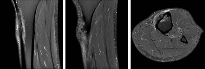 Three months later MR was repeated showing increase in size 42 × 40 × 27 mm and small areas of necrosis. Large attachment to the anterior periosteum remains with exophytic growth contacting the skin (Figure 3). With new imaging a third biopsy was performed guided with ultrasound. It showed trabecular osteoid areas that converge and areas of spindle cells with moderate cellular atypia, that suggested cPOS or HGSO.