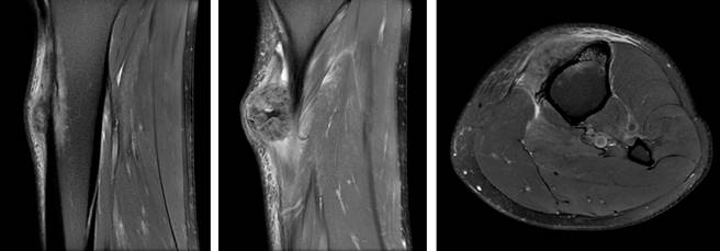 Initially a XR, CT and MR were performed showing a soft tissue tumor on the proximal aspect of the left tibia just inferior to the tibial tuberosity, size of 40 × 29 × 19 mm (coronal × sagittal × axial). Emerging from the anterior tibia periosteum and growing towards the subcutaneous tissue, hyperintense in T2 and hypointense in T1. Tumor presents with irregular and extensive internal calcifications (Figure 2). An initial biopsy was performed that was inconclusive, so an ultrasound guided biopsy was done afterwards with a 14G needle. The pathologist could not conclude between, hypertrophic fracture callus, osteoblastoma or osteosarcoma subtype osteoblastoma.