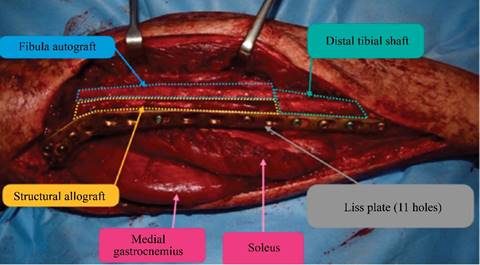 The classical Capanna Technique consists of inserting the harvested fibula carefully into a previously prepared allograft groove. At the tibial level the autogenous fibula is inserted 2-3 cm into the medullary canal of the distal tibial stump and proximally, it is placed at the center of the metaphysis or epiphyseal. When fibula insertion into de allograft care is taken to prevent damage to the vessels.15