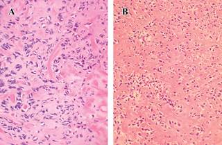 Figure 7: A) Tumor formed by cells with much nuclear pleomorphism (H&E, ×400). B) Cellular proliferation of diffuse growth pattern in which osteoid material is identified around the neoplastic cells (H&E, ×200).
