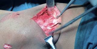 Figura 1: Disección del tendón cuadricipital (TC). Se observan dos incisiones longitudinales entre el primer y tercer cuadrante del TC (de medial a lateral del ancho del TC) y la utilización de las capas superficial e intermedia del mismo. Se mantiene íntegra la inserción patelar.