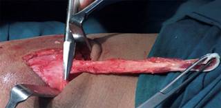 Figura 2: Injerto autólogo del tendón cuadricipital (TC). Se observa la obtención del injerto de TC, donde se realizó liberación del TC en la unión miotendinosa y se respetó el anclaje del tendón al polo superior de la patela (donde señala la tijera). Así queda un injerto de 1 cm de ancho y 8 a 10 cm de largo aproximadamente, dejando los bordes remanentes del tendón para cerrarlo.