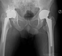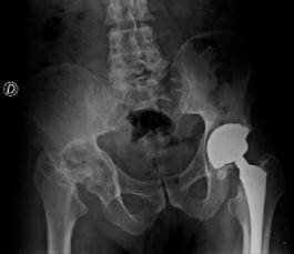 Figura 1: Radiografía anteroposterior de pelvis en la que se observa cadera derecha con colapso de la cabeza femoral, abundantes osteofitos, datos de esclerosis y presencia de quistes subcondrales. La cadera izquierda se observa con material protésico adecuadamente colocado, sin datos de rotura ni fatiga.