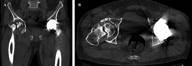 Figura 2: Tomografía computarizada simple de pelvis para precisar características del defecto acetabular derecho. A) corte coronal en el que se observa defecto acetabular con presencia de múltiples quistes subcondrales. B) corte axial en el que se evidencia defecto acetabular predominantemente de la pared posterior y compromiso parcial de la columna posterior.