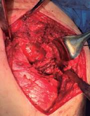 Figura 5: Malla de titanio colocada en defecto acetabular posterior a la impactación del injerto óseo mediante un abordaje lateral directo.