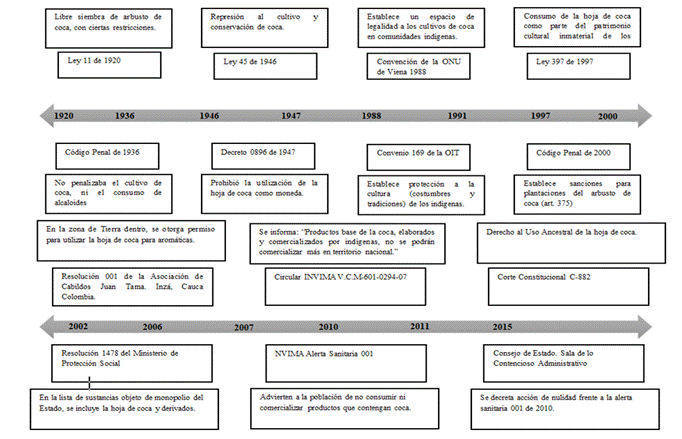 Adicionalmente, entre los antecedentes que se pueden encontrar en el marco jurídico colombiano (figura 1), respecto a la hoja de coca, se presenta en la siguiente línea del tiempo el resultado del trabajo de Troyano y Restrepo (2018), entrevistada para esta investigación.