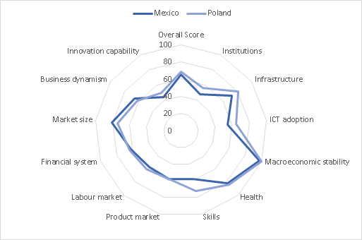 Reflecting the performance of Mexico and Poland in each of the competitiveness categories (i.e. a breakdown of the scores attributed to each of the 12 competitiveness pillars according to the WEF breakdown) in the radar chart leads to interesting conclusions (see Figure 1).