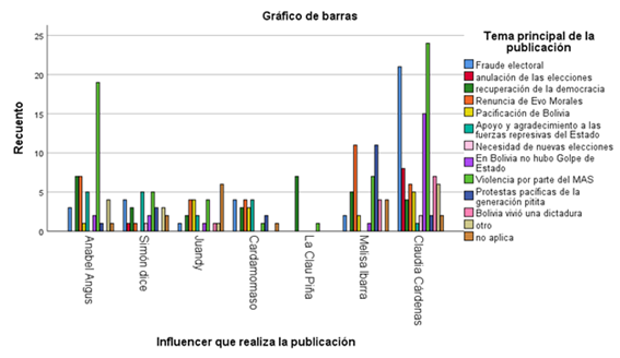 De igual manera, es importante señalar que los influencers presentaron ciertos temas en los que mostraban un uso del lenguaje que, ligado al objetivo político ideológico representaban los acontecimientos de cierta manera. Por ejemplo, para referirse a movilizaciones de seguidores o afines a Evo Morales, se referían a estos hechos como movilizaciones violentas. Siendo que cuando se referían a las movilizaciones de quienes pedían la renuncia de Morales, se trataba para ellos de manifestaciones pacíficas. En este sentido, las temáticas principales de las publicaciones fueron las siguientes: