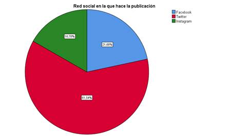 Para iniciar el análisis es importante describir con claridad cuál fue la red social que usaron los influencers con mayor énfasis. Tal como se muestra a continuación la red social con mayor uso en el periodo estudiado fue Twitter con el 61,54% frente a Facebook que alcanzó en 21,68% e Instagram que fue usado al 16,78%. Dato bastante llamativo, tomando en cuenta que según resultados de la Encuesta Nacional de Opinión sobre Tecnologías de Información y Comunicación (AGETIC, 2018, p. 21) tan solo el 17% de la población internauta de Bolivia usaría la red social Twitter, frente a un 94% que usaría Facebook.