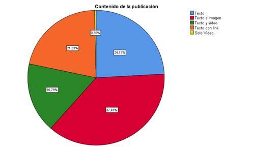 Por otra parte, existe un dato llamativo que responde a la cercanía porcentual con el uso solamente de texto con un 24,13% que dista solamente por 13,28 puntos porcentuales del uso de texto con imagen. Lo que posiblemente podría denominarse la supervivencia del texto, tal como lo denomina Pérez (2010) asegurando que “el mundo de los medios sociales está contribuyendo a relanzar la letra impresa, ahora sin papel” (p.55). El análisis de las publicaciones en sí evidencia que aún en la esfera digital se prepondera el uso del texto, ya que todas las publicaciones independientemente de la red social usan el texto como recurso permanente, con variación en el elemento multimedia que los acompaña.