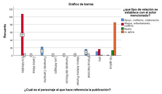 El 37,41%, es decir 107 publicaciones, del corpus hacen referencia a Evo Morales en un tono de ataque, enfrentamiento y conflicto, frente a un 7,7% (22) de publicaciones destinadas a mostrar apoyo, confianza y colaboración a Fernando Camacho, líder cívico cruceño que promovió la renuncia de Morales en cabildos ciudadanos en el Oriente del país y tras la renuncia de Morales ingresó a Palacio de Gobierno con una biblia en la mano, como un acto simbólico que insinuaba que los principios de la iglesia católica habían regresado al Palacio de Gobierno y que según este líder eran contrarios a los planteados por el gobierno de Morales. Así como lo reforzó la influencer Anabel Angus (2019a) quien mediante sus redes sociales afirmó “La democracia y Dios, vuelve al Palacio”, acompañado de una fotografía del mismo acto de Camacho, esto demuestra una connivencia entre la oposición a Morales y los influencers investigados (gráfico 4).