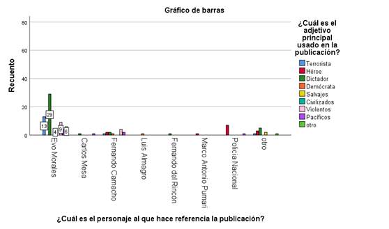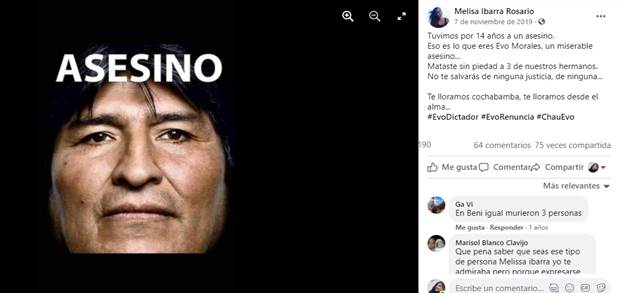 Con relación a lo anterior, el gráfico 5 evidencia que Evo Morales fue el personaje con mayor uso de adjetivos negativos, que lo presentaban como dictador, terrorista, salvaje y violento, como es el caso de Melissa Ibarra (2019) “tuvimos por 14 años a un asesino. Eso es lo que eres Evo Morales, un miserable asesino...” tal como se muestra a continuación (figura 6).