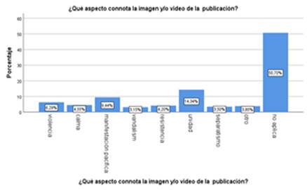 Por consiguiente, tal como se observa en el gráfico 7 las publicaciones en sí mismas tenían mayor connotación que los recursos multimedia. Siendo la “unidad” la mayor connotación con el 21,68% que se observó en las publicaciones. Los influencers posicionándose como portavoces de los defensores de la “democracia”, hacían un llamado a la unidad en contra a “ellos”, es decir quiénes eran afines al MAS y Evo Morales. Seguida de la connotación asociada a la violencia con un 12,94% relacionada directamente con quienes eran afines al MAS según la representación por parte de los influencers.