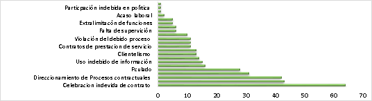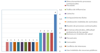 Una corrupción que permea todas las esferas en nuestro país y que hoy desde la misma institución se debe hacer un trabajo arduo para cambiar este panorama de cara a la ciudadanía que exige un control disciplinario con funcionarios eficaces y eficientes en la gestión y como lo muestra la figura de los actos de corrupción que mayor mente dificultan las investigaciones tiene que ver con la celebración de contratos y el tráfico de influencia como ha quedado demostrado. (ver por ejemplo Mejía, Ahumada y Coavas, 2020). Por su parte en la muestra que corresponde a las procuradurías regionales se encontraron que los actos de mayor corrupción corresponden a la dirección de procesos contractuales (ver figura):