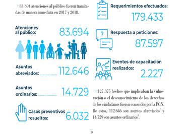 El informe de este periodo respecto de la función preventiva dice que se resolvieron 314.831 procesos, de estos se efectuaron 115.029 (36%) requerimientos, el 20% asuntos abreviados resueltos que corresponde a 63.302 y 58.091 que sería un 18% de la atención a público solucionada (Procuraduría General de la Nación, 2018).