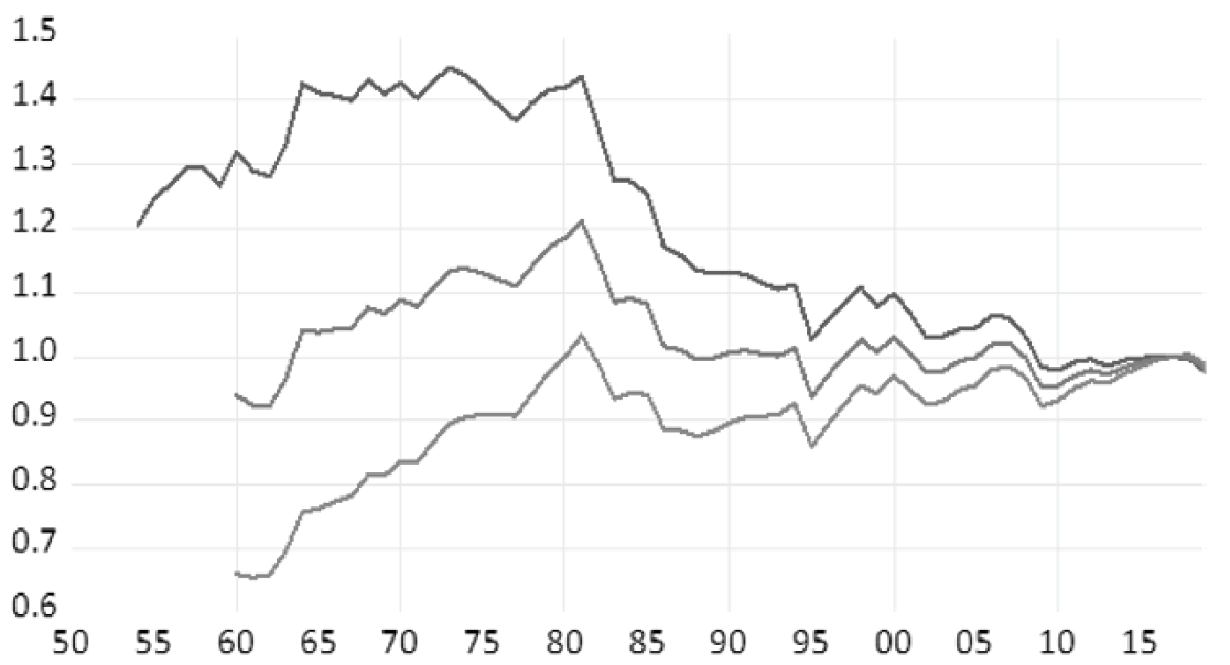 El Cuadro 3 muestra que, entre 1961 y 2019, el crecimiento de largo plazo del PIB por hora empleada convergía a un valor cercano alrededor de 0.2%, mientras que el crecimiento del PIB per cápita de equilibrio mostraba un valor de poco más de 1% en términos anuales. Para los últimos veinte años analizados, estas cifras han caído considerablemente y son cercanas a -0.2% y 0.4%, respectivamente.