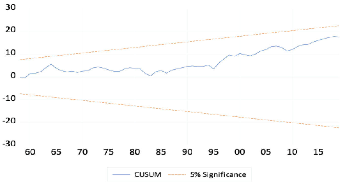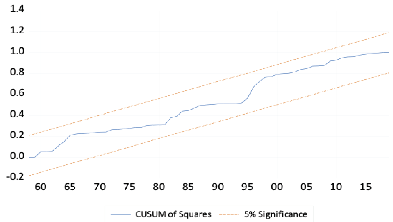 Las pruebas CUSUM y CUSUMSQ de la ecuación (8) no muestran inestabilidad en los coeficientes de las regresiones estimadas por MCO.10 La prueba de múltiples puntos de quiebre no reporta ningún año donde se pueda detectar un cambio estructural de las estimaciones. Las pruebas CUSUM y CUSUMSQ descritas se muestran en el apéndice econométrico de este trabajo.