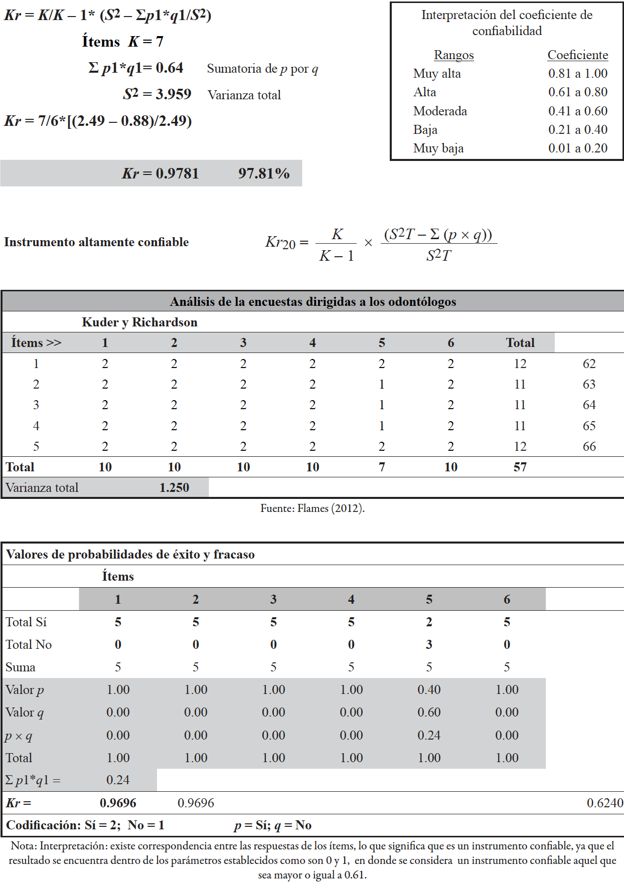 Se utilizó la prueba de validación de los instrumentos de recolección de datos mediante el cálculo del coeficiente de confiabilidad Kuder y Richardson, como sugiere Hernández Sampieri et al. (2014). Se emplean instrumentos de alternativas de respuesta dicotómicas de sí y no y se aplica a una muestra piloto de 5 y el número de ítems del instrumento. Resultados: estudiantes KR = 0.9696 que significa Muy Alta Confiabilidad; clientes odontológicos KR = 0.9781 que significa Alta Confiabilidad y odontólogos KR = 0.9696 que significa Alta Confiabilidad (An ex os). Todos los instrumentos utilizados aseguran confiabilidad o fiabilidad de manera que la xinformación que arrojan es confiable en términos de la distribución norma