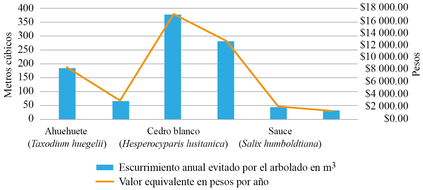 El monto económico [2] de los servicios ecosistémicos estimados se calculó considerando precios de 32 197 pesos por tonelada métrica de dióxido de carbono, 469 138 pesos por tonelada métrica de ozono, 70 071 pesos por tonelada métrica de dióxido de nitrógeno, 25 529 pesos por tonelada métrica dióxido de sulfuro y 16 284 914 pesos por tonelada métrica de material particulado menor a 2.5 μm. El valor del escurrimiento evitado se determinó con base en el precio de 44.91 pesos por m³. Estos referentes se establecieron desde parámetros nativos asociados a las bases de datos más actualizadas del programa.