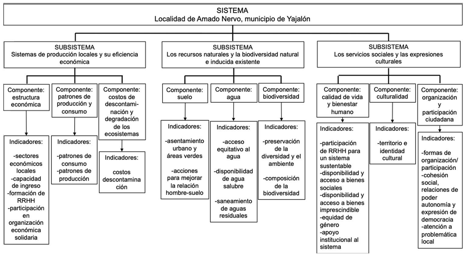 De los subsistemas derivaron los componentes que se determinaron con base en la examinación y evaluación de la plataforma de indicadores temáticos núcleo de la ONU (Singh et al., 2009), en estudios relacionados a la sustentabilidad que orientan y dan soporte como plataforma teórica (Moller, 2010) y en la observación permanente y experiencias personales en el sitio de estudio. De esta manera, se estimaron para el primer subsistema la estructura económica y los patrones de producción y consumo; para el segundo, es el suelo, agua, y biodiversidad; para el tercero, la calidad de vida y bienestar humano, culturalidad y organización y participación ciudadana.