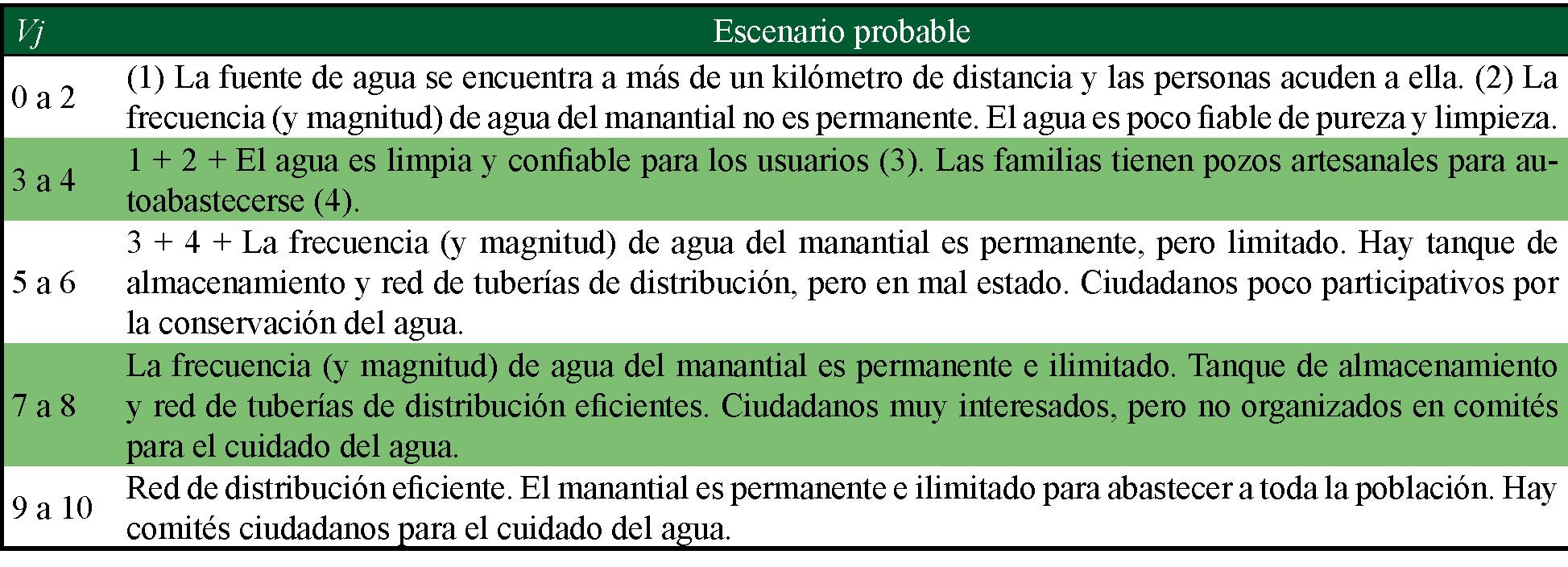 Para establecer el valor de los indicadores, se procedió, primero, a determinar su importancia por medio de un factor de ponderación (Fp) y, en seguida, la aplicación de la escala de análisis a partir del concepto valor de juicio (Vj). La ponderación y la escala se hicieron por cada indicador y se aplicaron a pobladores elegidos al azar; ambas se usaron para ponderar una amplitud de 1 a 3 en tres niveles: muy importante = 3, medianamente importante = 2, poco importante = 1). Para ilustrar, la tabla 1 utiliza el indicador de Acceso equitativo al agua.