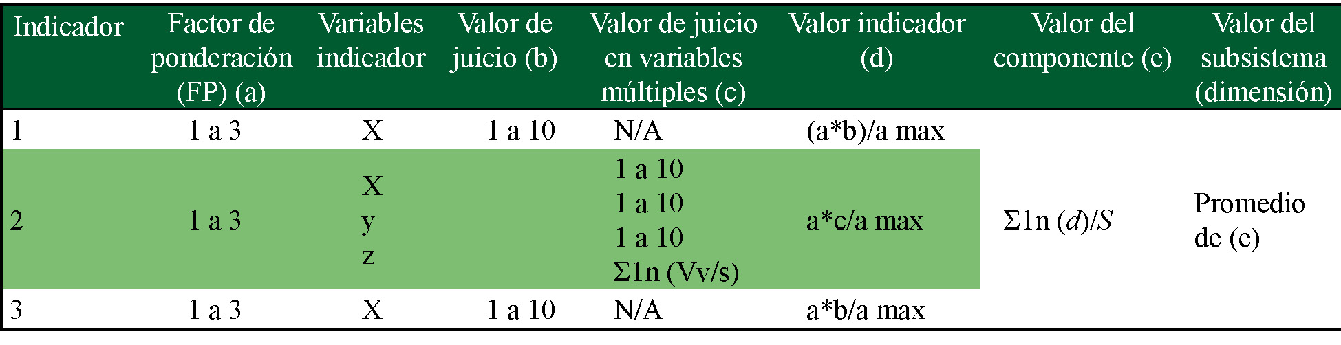 | Indicador | Factor de ponderación (FP) (a) | Variables indicador | Valor de juicio (b) | Valor de juicio en variables múltiples (c) | Valor indicador (d) | Valor del componente (e) | Valor del subsistema (dimensión) |