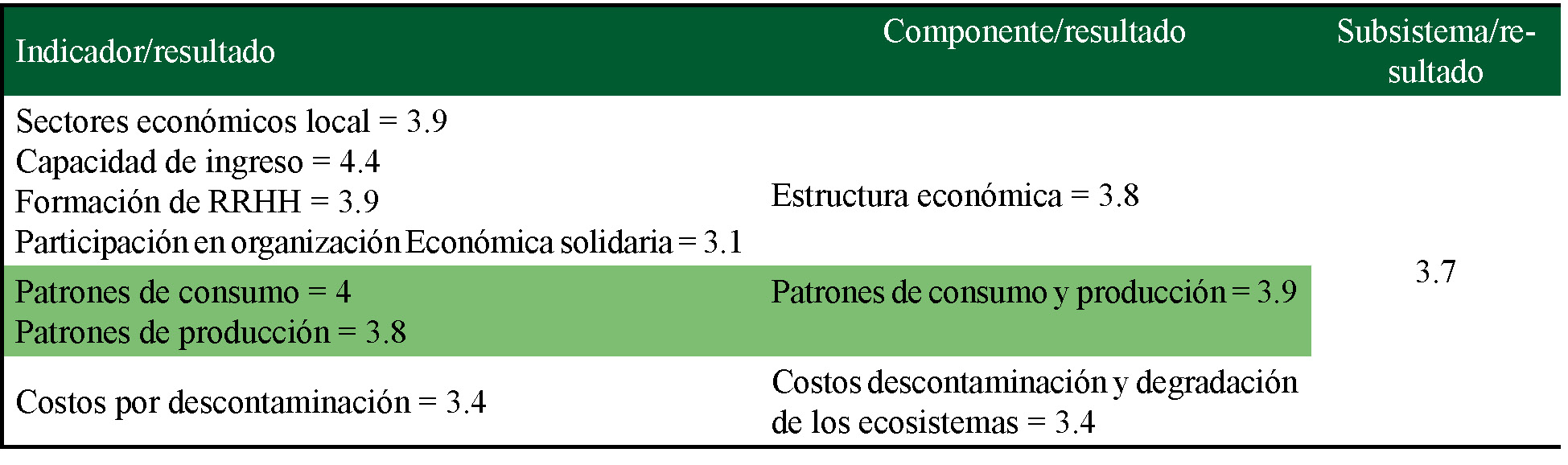 En esta sección se estudia la capacidad de los sistemas productivos locales de suministrar bienes y servicios a la familia y a la comunidad, así como de la capacidad de la comunidad para conservar esos recursos desde una perspectiva sustentable. Los indicadores estudiados se muestran en el cuadro 2, al igual que sus resultados en la escala de análisis. De acuerdo con lo que presenta el cuadro, este es un subsistema con un IGS = 3.7, que lo ubica orientado al “desarrollo no sustentable” y expresa una situación crítica del subsistema.