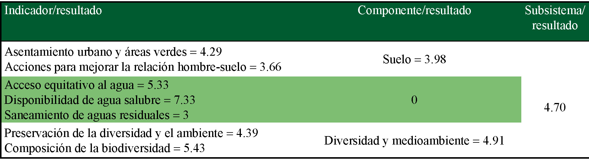 En cuanto a los indicadores que emanaron de los componentes, se establecieron en atención a a) identificar y describir factores, elementos, o aspectos representativos, constituyentes de la comunidad, que son parte de la vida cotidiana y están presentes en forma usual asociados a un componente, y b) a que los indicadores fueran congruentes con los objetivos del componente a los que están asociados y midieran sus diferentes aspectos. A manera de ejemplo, del subsistema biodiversidad (dimensión ecológica), del componente agua derivaron tres indicadores: acceso equitativo al agua, disponibilidad de agua salubre y saneamiento de aguas residuales.