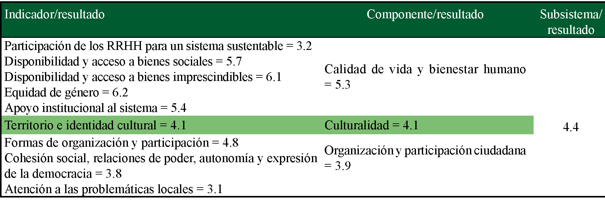 En este apartado se analiza el aporte en bienes y servicios de calidad para el bienestar y la identidad cultural de la comunidad considerando tres componentes básicos y sus respectivos indicadores. Los resultados se observan en el cuadro 4, el subsistema (IGS = 4.4) indica un subsistema inestable.