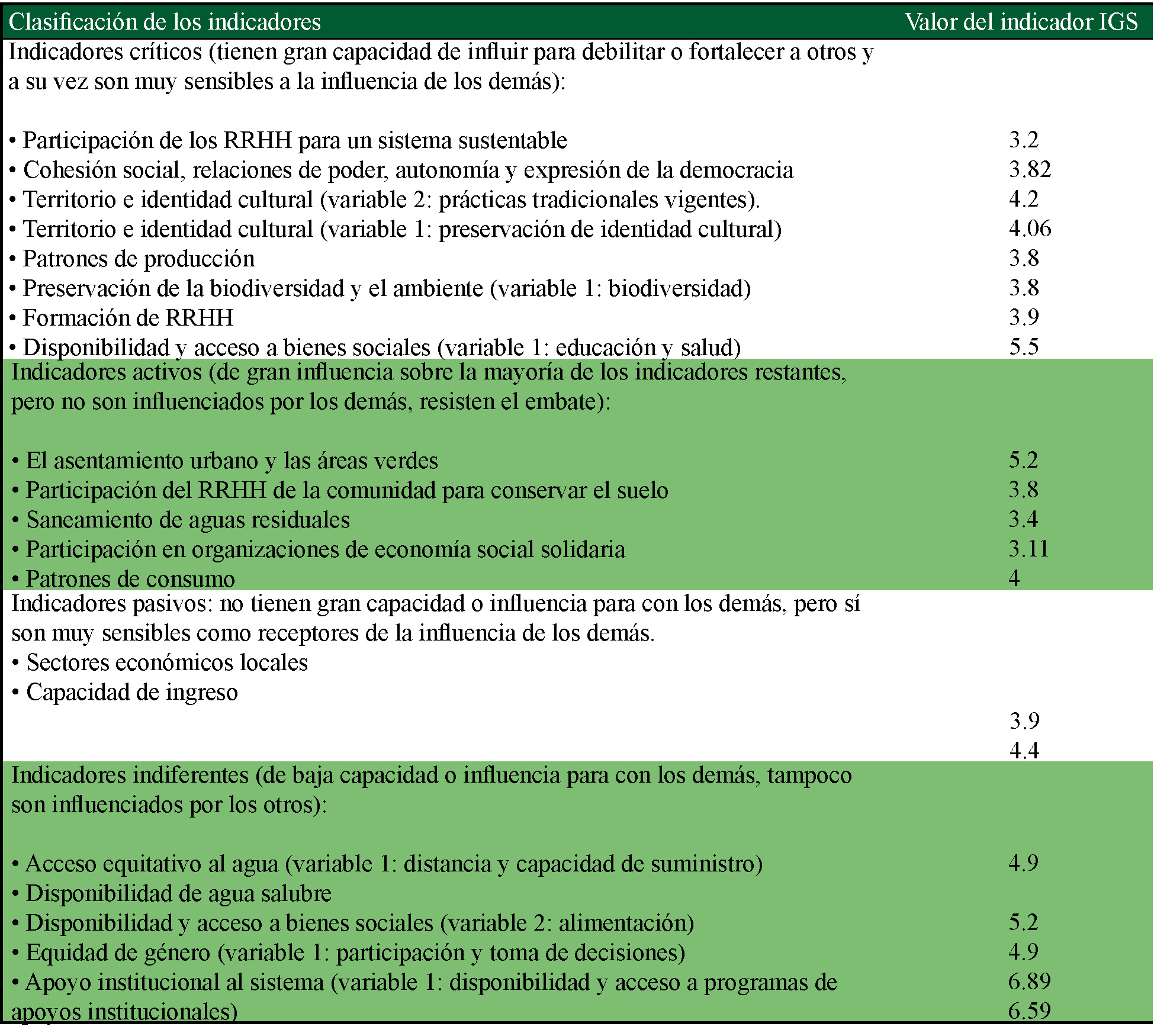 | Indicadores activos (de gran influencia sobre la mayoría de los indicadores restantes, pero no son influenciados por los demás, resisten el embate): • El asentamiento urbano y las áreas verdes • Participación del RRHH de la comunidad para conservar el suelo • Saneamiento de aguas residuales • Participación en organizaciones de economía social solidaria • Patrones de consumo | 5.2 3.8 3.4 3.11 4 |