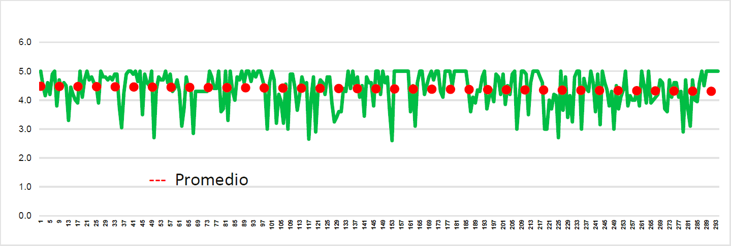 | Promedio de la escala | 3.9 | 4.44 | 4.67 | 4.32 | 3.68 | 4.83 | 4.61 | 4.56 |