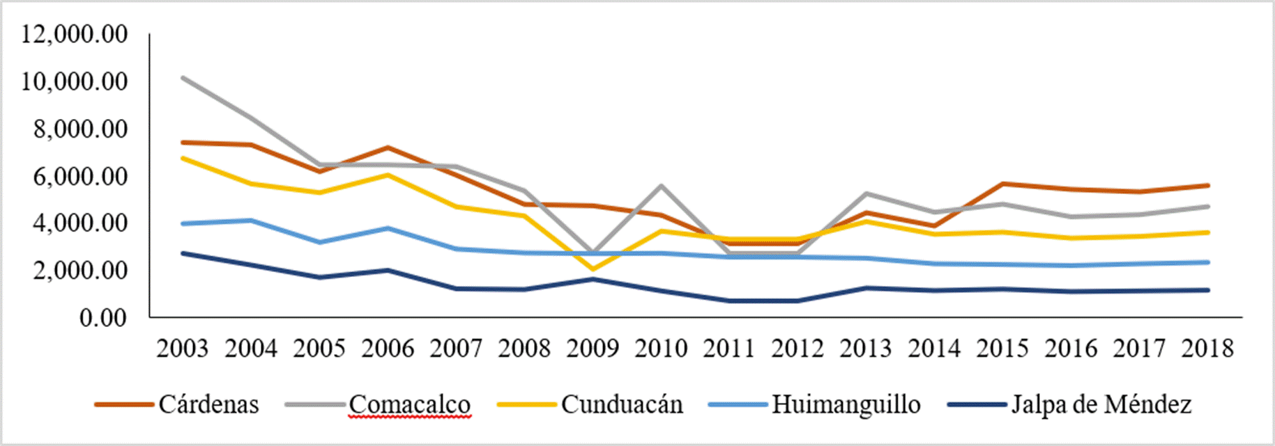 En Tabasco, los municipios que más producen son Cárdenas, Comalcalco, Cunduacán, Huimanguillo y Jalpa de Méndez, siendo Comacalco el de mayor productor hasta 2014, cuando Cárdenas le supero (véase Gráfica 2). En 2008, la mayor parte de los municipios sufrieron caídas importantes en el volumen de producción y aunque ésta ha repuntado, no se han recuperado los valores originales anteriores a 2003. Esta situación, aparejado de un aumento constante de la demanda, ha generado un aumento en el precio medio rural estatal de cacao, pasando de 17 mil pesos en 2003 a 40 mil pesos por tonelada en 2018 (Sader, 2019).