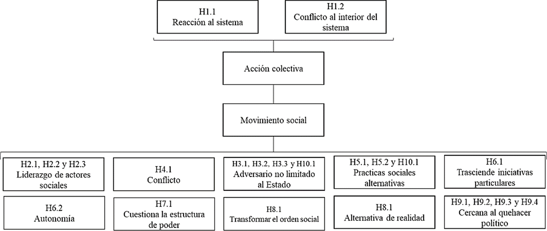 La información recopilada en la fase 2 (Figura 1) fue analizada con el software Nvivo 12 (Nvivo, 2018), a través de un modelo de análisis basado en los elementos teóricos de la acción colectiva, así como en los elementos, objetivos y fases teóricas de los nuevos movimientos sociales, con base en el apartado teórico. Se desarrollaron 20 hipótesis de trabajo que buscaban representar la percepción de la acción colectiva de las OSC (Figura 2). Estas hipótesis se presentaron, como enunciados afirmativos de la percepción de las OSC, sobre su propia acción, entre 2014-2018.
