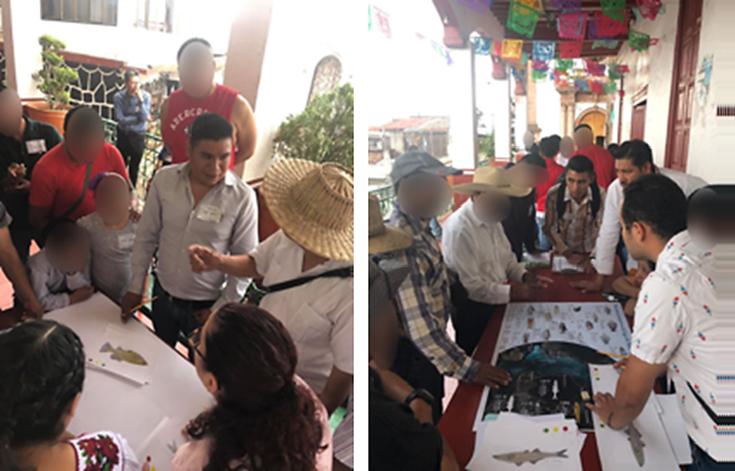 Figuras 2 y 3 Taller de retroalimentación sobre recursos pesqueros del lago de Pátzcuaro. Los rostros visibles corresponden a los facilitadores del taller, los rostros difuminados a los habitantes de la isla de Janitzio.