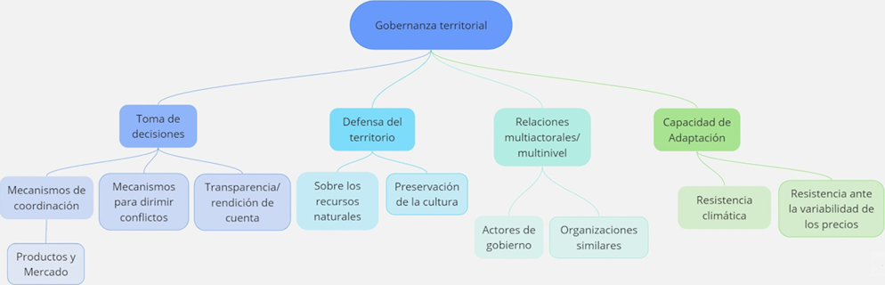La estructura anterior se construyó considerando que la gobernanza está vinculada a la participación de los diversos actores en un conjunto de procesos territoriales, que a la postre, son acuciantes y estratégicos en la dinámica económica del municipio, demandando de los SIAL una mirada integradora y una visión participativa donde los actores del territorio son los principales promotores del proceso, al involucrarse y desarrollar en un plano ideal capacidades de gestión, empresariales y organizativas, así como mecanismos de concertación y resolución de conflictos que les permitan apropiarse de los procesos de cambio, siempre y cuando fortalezcan o construyan cohesión social ante las amenazas fragmentarias del contexto. En ese sentido se tomaron en cuenta cuatro niveles: toma de decisiones, defensa del territorio, relaciones multiactorales/multinivel y capacidad de adaptación. La toma de decisiones se trabaja de acuerdo con el grado de participación de los productores en el SIAL, sobre todo haciendo énfasis en las formas como esa gobernanza se manifiesta a partir de los tipos de mecanismos de coordinación para acceder a mercados, la solución de conflictos y la transparencia y rendición de cuenta de esas decisiones.