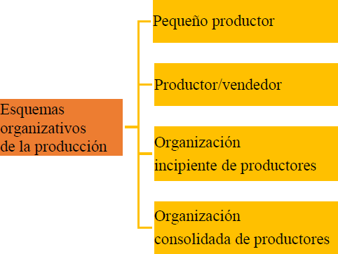 Organización de productores incipiente: a este grupo pertenecen diversos actores que forman parte de organizaciones con cierto grado de consolidación aunque no del todo maduras, ya sea como asociación de productores, grupos sociales, colectivos de mujeres o cooperativas de reciente constitución, cuyo funcionamiento no se encuentra lo suficientemente maduro, aunque establecen relaciones de gobernanza de los sistemas productivos con tendencia a la horizontalidad y esquemas de cooperación solidarios. En sentido general, las principales características identificadas a partir de las entrevistas fueron las siguientes: