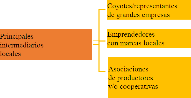 Actores locales fundamentales en las relaciones con los esquemas productivos y que son los que más interactúan con los niveles analizados, son los intermediarios presentes en las producciones de café, sobre todo regionales. Se dificulta realizar una labor precisa de mapeo por la falta de un censo o estadísticas fidedignas, por lo que de forma somera se identificaron tres grupos con la presencia más relevante en el municipio (Gráfico 3). En primer lugar, los denominados coyotes, los cuales son personas que cuentan con el capital y la astucia para comprar a precios normalmente bajos a los distintos productores. Son vistos como un mal necesario por algunos actores locales, ya que es la vía más rápida para comercializar sus productos, donde el precio es la única norma que rige las transacciones y no pocas veces resulta injusto a los ojos de quienes sufren las vicisitudes del rigor de la labor que requieren los cultivos.